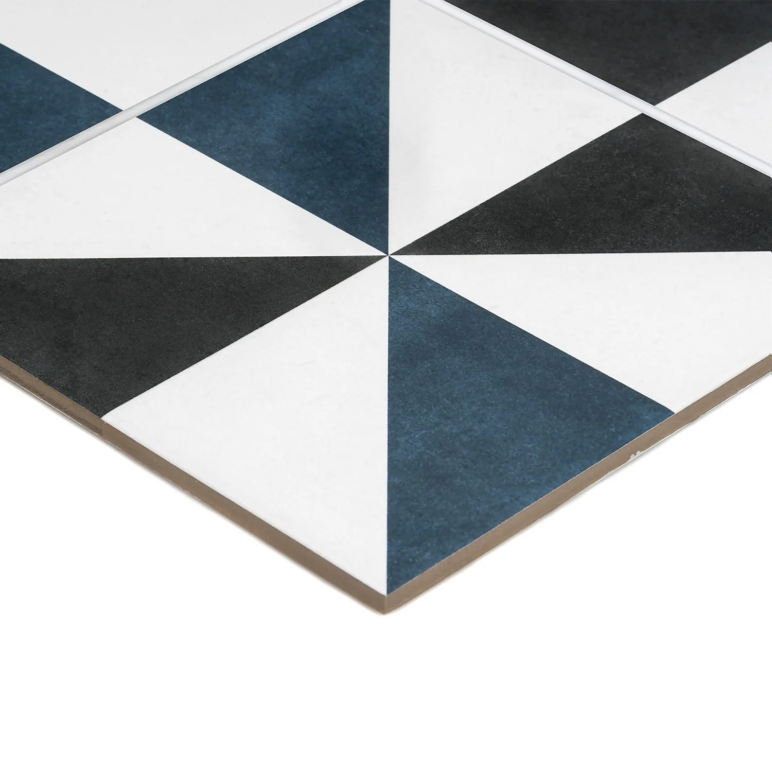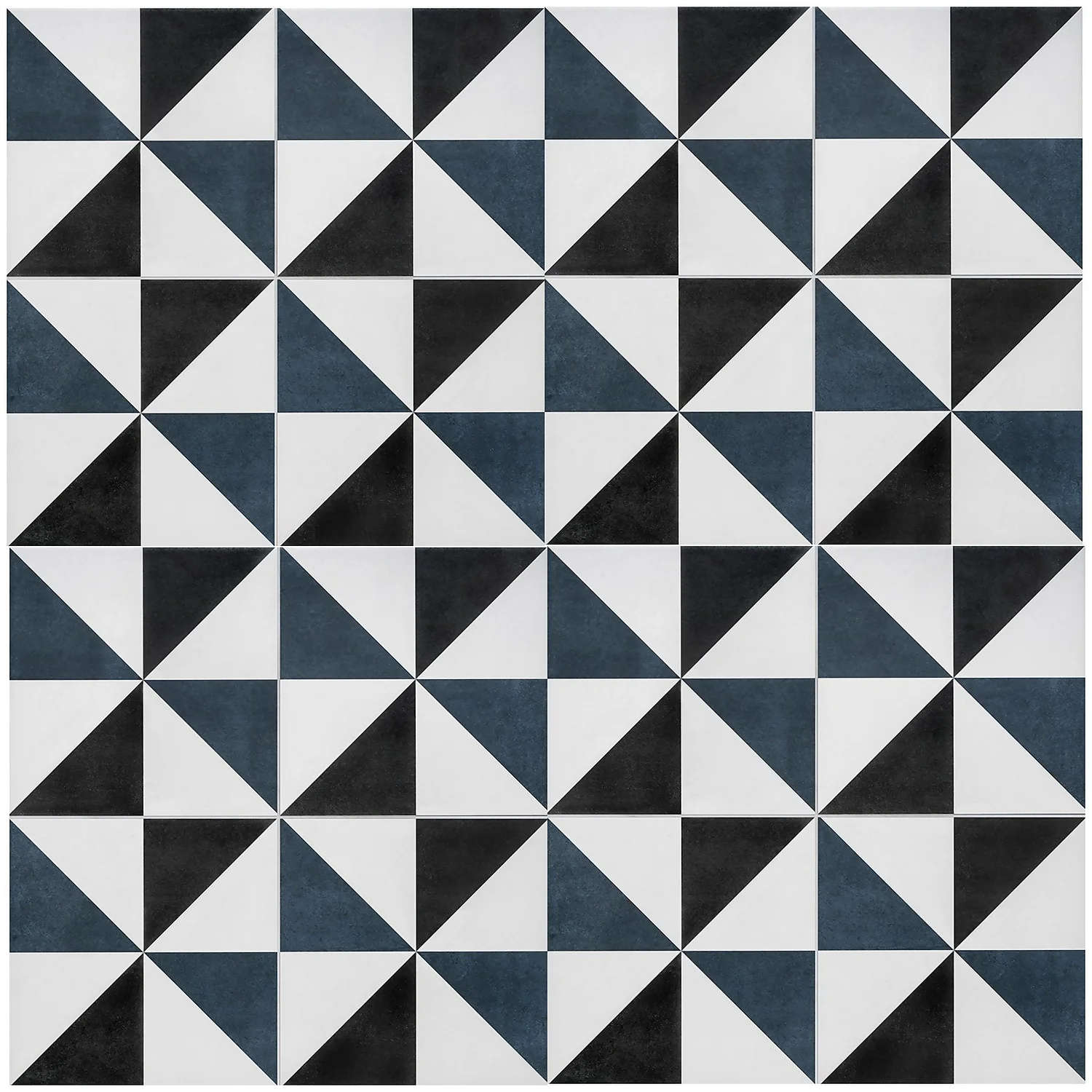 This House Beautiful tile is a larger format tile from their Cube collection. Windmill boasts a black, white and blue smaller scale ‘half and half’ pattern. These tiles feature an encaustic effect, which creates a chalky like matt finish. Each tile has pre-scored lines that create the effect of four smaller tiles, but make installation much easier. They’re both beautiful and practical. Monochromatic colours make it easier to create inspiring feature walls or floors. The durability of porcelain makes these tiles suitable for any space in your home, including high-traffic areas. Windmill makes achieving the half and half look much easier as the pattern is ready to go, all you have to do is install it!