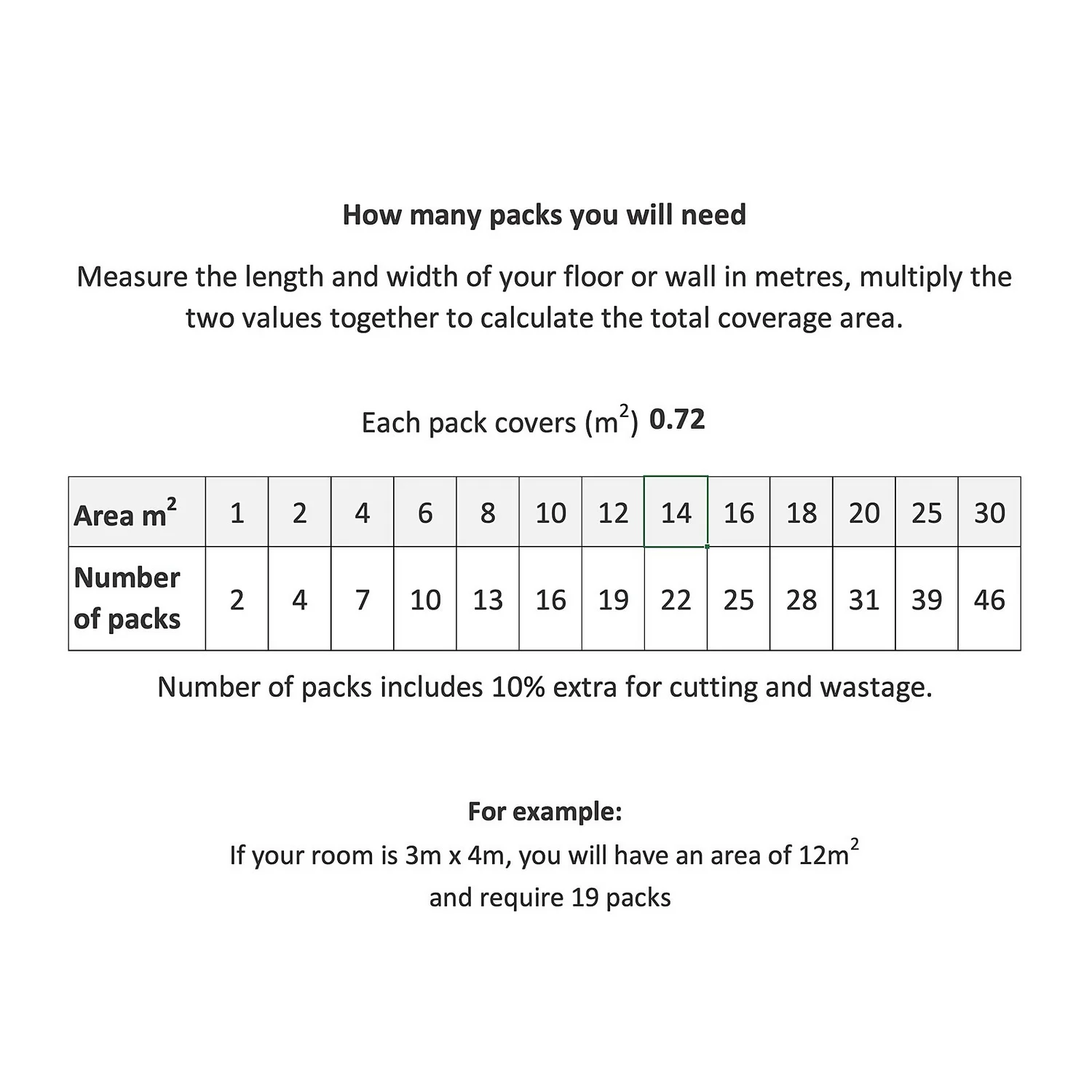 - Tile size: 60 x 60cm and 2cm deep. Each pack contains 2 tiles, which covers 0.72sqm. For a 10sqm patio you would need to order 15 packs, making it 30 tiles (incl. +10% extra for wastage)